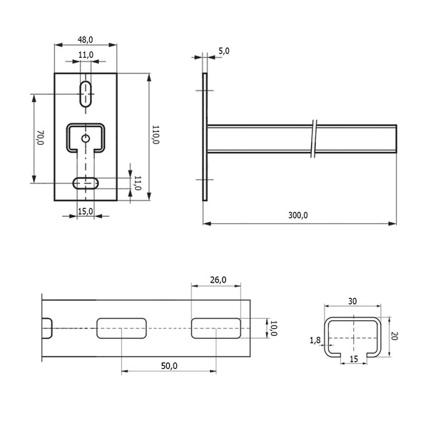Консоль подходит для монтажа к перекрытиям. Для удобства монтажа крепёжные отверстия размещены под углом 90". Подходит для монтажа внутри и снаружи зданий.
