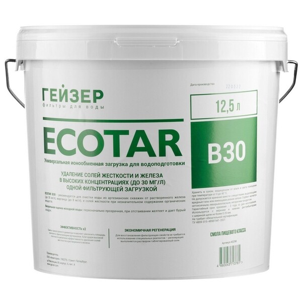 Универсальная ионообменная загрузка для водоподготовки. Рекомендуется для очистки воды из артезианских скважин от растворенного железа (до 30 мг/л), марганца (до 8 мг/л) и солей жесткости при незначительном содержании органических веществ. Визуальная оценка исходной воды – первоначально прозрачная, при отстаивании желтеет и даёт бурый осадок.