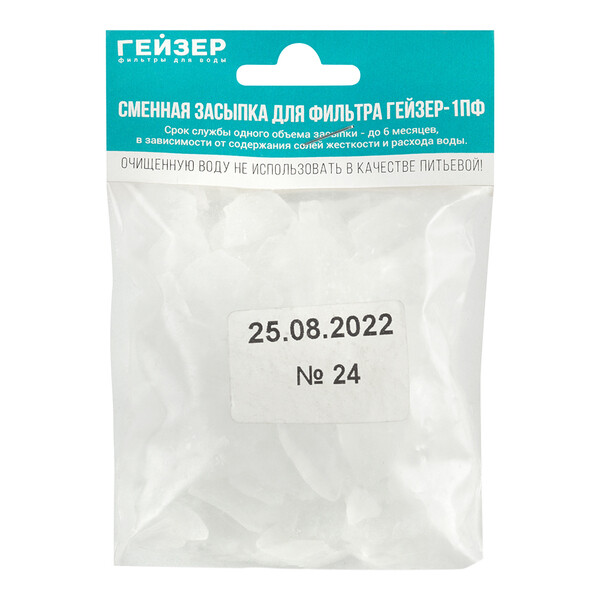 Засыпка из полифосфата для умягчения воды применяется в фильтрах Гейзер 1ПФ и 1ПФД. Кристаллический полифосфат применяется для защиты нагревательных элементов стиральных, посудомоечных машин и водонагревателей от накипи. Полифосфат связывает растворенное железо, предотвращая появление желтых разводов на белье во время стирки. По мере использования полифосфат медленно растворяется в воде. Воду можно использовать в технических целях – мыть посуду, стирать белье, принимать душ. Не использовать в качестве питьевой!