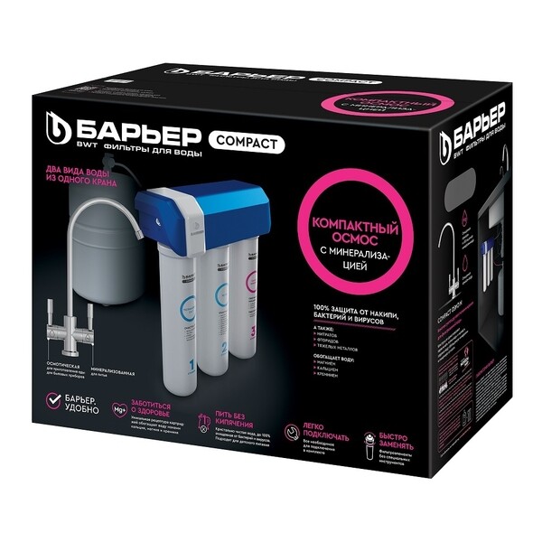 Компактное стильное решение для кухни – трехступенчатая обратноосмотическая система БАРЬЕР по эффективности, соответствующая классическому пятиступенчатому осмосу. Запатентованная технология Поликарбон 2 в 1, технология Карбоминерал – минерализация магнием, кальцием и кремнием, технология OneTouch – быстрая замена картриджей, технология Smat Lock – защита от протечек, технология Optimal Drain – сниженный сброс воды в дренаж. Фильтр обеспечивает 100% защиту от накипи, бактерий, вирусов, а также нитратов, фторидов и тяжелых металлов. Обогащает воду магнием, кальцием и кремнием. Ресурс фильтрующей системы 5 000 литров, рекомендуемая частота замены второй ступени – обратноосмотической мембраны до 18 месяцев, 1 и 3 ступени до 6 месяцев. Производительность мембраны 100 галлон. Общий объем накопительной емкости 12 литров. Тип крепле...