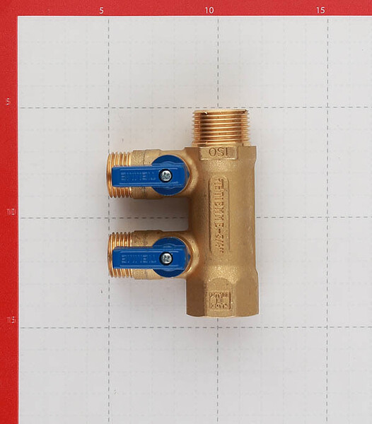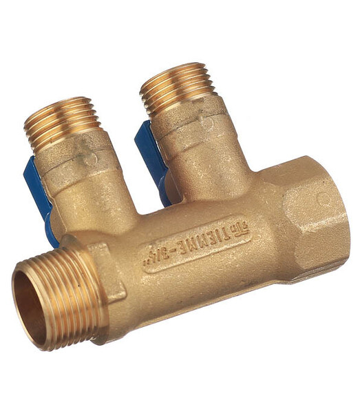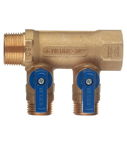 Предназначен для равномерного распределения и поступления воды от главного трубопровода по металлопластиковым трубам к сантехнике и другим потребителям без потери напора воды. Позволяет изолировать часть системы в случае неисправностей и проводить ремонт, не производя при этом общего отключения водоснабжения. Используется для разделения потока воды из одной трубы на две линии. Имеет с одного входа внутреннюю резьбу 3/4" (20 мм) с другого входа наружную резьбу 3/4" (20 мм), что позволяет соединять коллекторы между собой, увеличивая количество отводимых линий. Ручки синего цвета. Межосевое расстояние между отводами 36 мм.