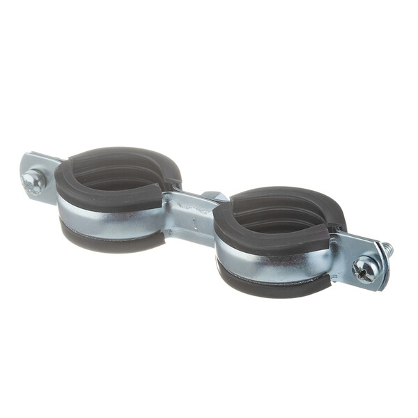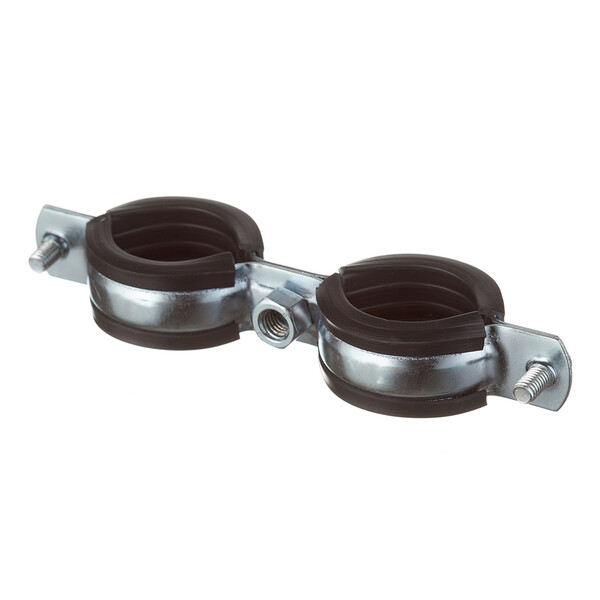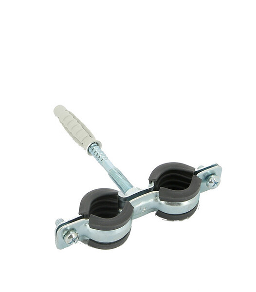 Предназначен для крепления полипропиленовых, полиэтиленовых или иных труб диаметром 32-36 мм к стене или к полу. Два одновинтовых хомута на двойной скобе для параллельного монтажа двух труб, шуруп-винт и дюбель в комплекте, дополнительные элементы не нужны. Звукоизоляционный вкладыш из EPDM-резины, черный, вкладыш устойчив к старению. Производитель рекомендует использовать дюбель диаметром 10 мм.