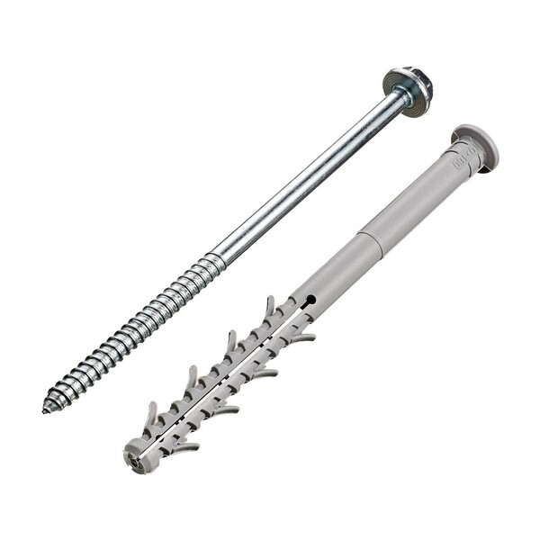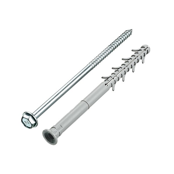 Дюбель фасадный предназначен для крепления строительных материалов и изделий к основаниям. Для средних и высоких нагрузок. Материал применения – тяжелый и легкий бетон, полнотелый и пустотелый керамический кирпич, силикатный кирпич, ячеисто – и керамзитобетонные блоки. Цилиндрический бортик дюбеля предотвращает контактную коррозию. Для установки необходимо предварительное сверление отверстия. Класс прочности шурупа 8,8 позволяет выдерживать высокие нагрузки на вырыв и срез.