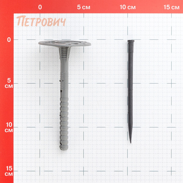 Предназначен для крепления легких теплоизоляционных изделий к внутренним и наружным поверхностям зданий различного назначения, в том числе в системах вентилируемых фасадов, штукатурных фасадов и колодезной кладке, в такие основания, как тяжелый и легкий бетон, полнотелый керамический и силикатный кирпич, керамзитобетонный блок. За счет широкой шляпки дюбель часто называют "парашют" или тарельчатый дюбель. Конструкция широкой шляпки дюбеля плотно прижимает теплоизоляцию, отверстия позволяют утопить дюбель в клее без потери эластичности шляпки. В комплекте с дюбелем поставляется пластмассовый гвоздь, который для большей прочности армирован стекловолокном. Цвет изделия не влияет на технические характеристики.