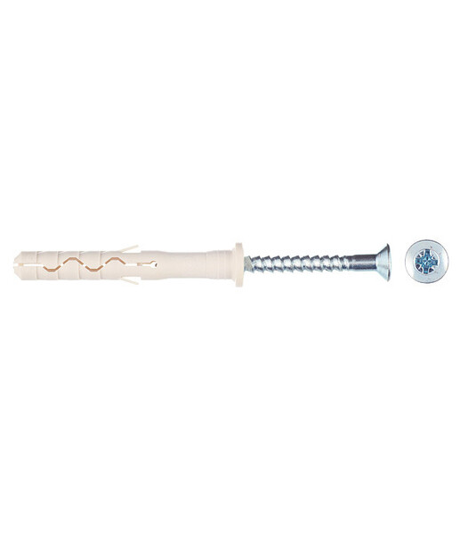 Предназначен для легких креплений (небольшие нагрузки) в твердые материалы: полнотелый кирпич, бетон, природный камень. Нейлон обеспечивает надежное сцепление с материалом основания. Резьбовой оцинкованный гвоздь повышенной прочности заранее установлен в дюбель.