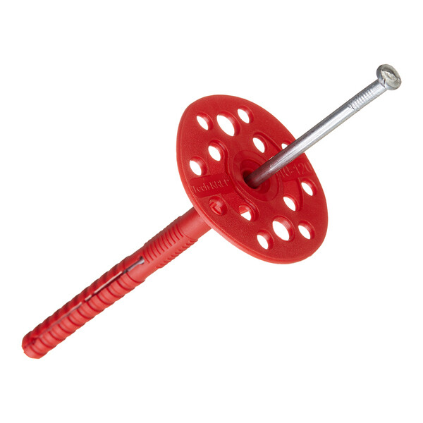 Предназначен для крепления теплоизоляционных изделий толщиной к внутренним и наружным поверхностям зданий, различного назначения, в том числе в системах вентилируемых фасадов и колодезной кладке, в такие основания, как тяжелый и легкий бетон, полнотелый керамический и силикатный кирпич, керамзитобетонный блок. За счет широкой шляпки дюбель часто называют "парашют" или тарельчатый дюбель. Конструкция широкой шляпки дюбеля плотно прижимает теплоизоляцию, отверстия позволяют утопить дюбель в клее без потери эластичности шляпки. В комплекте с дюбелем поставляется металлический оцинкованный гвоздь.