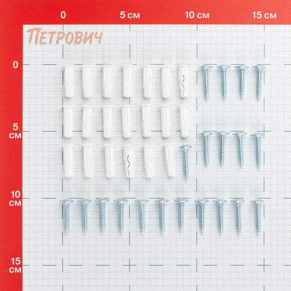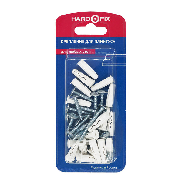 Комплект крепежа, предназначенный для крепления плинтуса, обеспечит легкий и надежный монтаж. Преимуществом комплекта является универсальный нейлоновый дюбель, который монтируется в любые стены – бетон, кирпич, гипсокартон, газобетон, пенобетон и обеспечивает надежное крепление в стене. Шуруп, входящий в комплект, имеет широкую шляпку, которая обеспечивает хороший прижим плинтуса к стене.