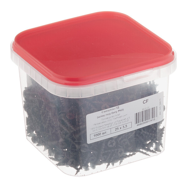 Предназначены для крепления материалов и легких конструкций к деревянным основаниям без предварительного сверления, например – гипсокартона, реек для обрешетки, соединения деревянных деталей и др. Саморезы имеют потайную головку с крестообразным шлицем PH2, острый наконечник и редкую резьбу. Производятся из углеродистой стали с последующим оксидированием для защиты от коррозии. Саморезы имеют полную резьбу. Фактическая длина может отличаться от заявленной +/ – 1 мм