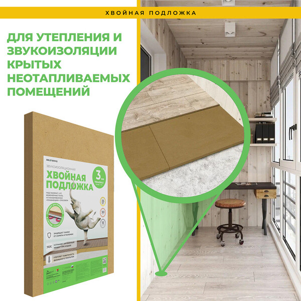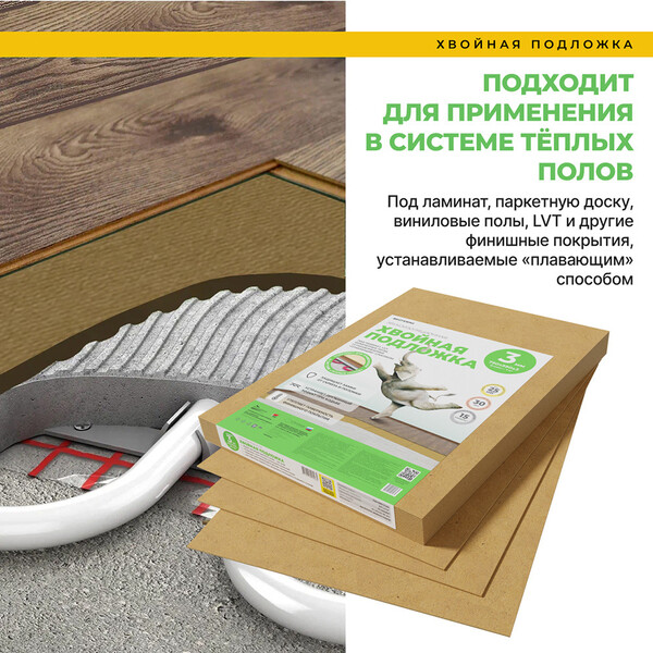 Звукоизоляционная хвойная подложка под ламинат, LVT, инженерные полы, устанавливаемые "плавающим" способом.