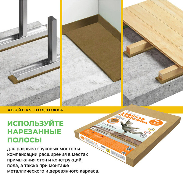 Звукоизоляционная хвойная подложка под ламинат, LVT, инженерные полы, устанавливаемые "плавающим" способом.