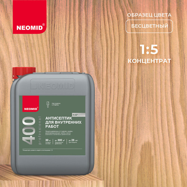 Антисептик для дерева Неомид 400 новое высокоэффективное деревозащитное средство на водной основе для внутренних работ. Предназначено для усиленной защиты древесины на срок до 25 лет от гниения, поражения дереворазрушающими и деревоокрашивающими плесневыми грибам. Способно как предотвращать биопоражение, так и останавливать уже начавшиеся процессы разрушения древесины биологическими агентами. Не изменяет структуру древесины, не препятствует дальнейшей обработке, склеиванию и окраске. Экологически безопасен, не токсичен.