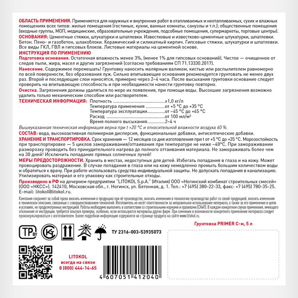 Primer C-м — грунтовка глубокого проникновения для подготовки минеральных оснований перед укладкой керамических, каменных и керамогранитных облицовок на цементные клеевые смеси, штукатурными работами и устройством стяжки. Морозостойкая при транспортировке.
