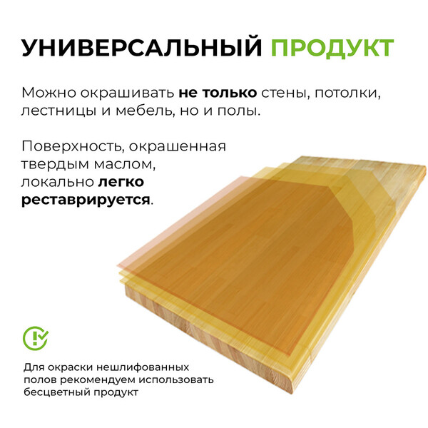 Универсальная краска из натуральных масел, смол и восков. Рекомендуется для окраски деревянных стен, потолков, полов, лестниц, мебели, а также пробки и ОСБ.