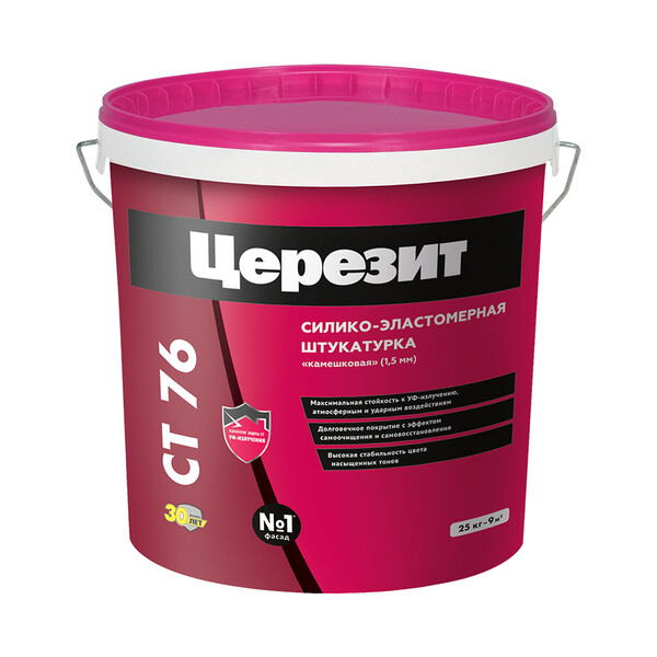 Силиконовая эластомерная декоративная штукатурка «камешковая», зерно 1,5 мм. Силиконовая эластомерная декоративная штукатурка CT 76 предназначена для изготовления тонкослойных декоративных покрытий интенсивных цветов с зернистой фактурой на бетонных основаниях, в том числе традиционных и гипсовых штукатурках, древесностружечных плитах, гипсокартоне и т.д. Рекомендована для систем фасадных теплоизоляционных композиционных (СФТК) с теплоизоляционным слоем из пенополистирольных (Церезит VWS) и минераловатных (Церезит WM) плит. Выпускается в виде 2-ух баз (стандартная и транспарентная) и подлежит обязательной колеровке. Обладает повышенной стойкостью к температурным перепадам. Наличие в составе армирующих микроволокон обеспечивает повышенную прочность и стойкость к образованию трещин. Может быть колерована в соответствии с Церезит Colou...