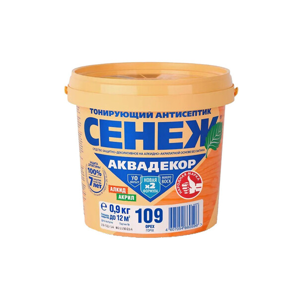 Антисептик Сенеж Аквадекор предназначен для долговременной защиты древесины от атмосферных осадков, плесневых, деревоокрашивающих и дереворазрушающих грибов, водорослей и насекомых-древоточцев, а также декоративной отделки под ценные породы. Сочетание в Сенеж Аквадекор алкидов, акрилатов и льняного масла улучшает проникновение в древесину, формирует эластичное дышащее защитное покрытие с мягким шелковистым блеском. Сенеж Аквадекор защищает древесину от биопоражения и влаги, а также придает оттенки благородных пород дерева. Без запаха. Не требует опыта и специальных навыков для применения. Антисептик Сенеж Аквадекор применяют при наружных и внутренних работах для обработки новых и ранее обработанных антисептиком стен, обшивок, перегородок, фронтонов, дверей, оград, садовой мебели, фанеры, шпона, ДСП и ДВП, а также других пиленых, строга...