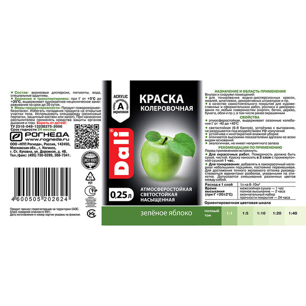 Предназначена для колеровки водно-дисперсионных строительных и декоративных материалов, художественных и оформительских работ, росписи, декорирования. Может использоваться в качестве самостоятельного покрытия по любым поверхностям (бетон, кирпич, штукатурка, дерево, бумага, обои и пр.), в т.ч. ранее окрашенным. Применяется внутри и снаружи помещений. При окрашивании больших площадей, смешайте все необходимое количество материала в одной емкости и производите колеровку сразу на весь объем работ. Помните, что в условиях ручной колеровки, вы не сможете получить дважды один и тот же цвет.