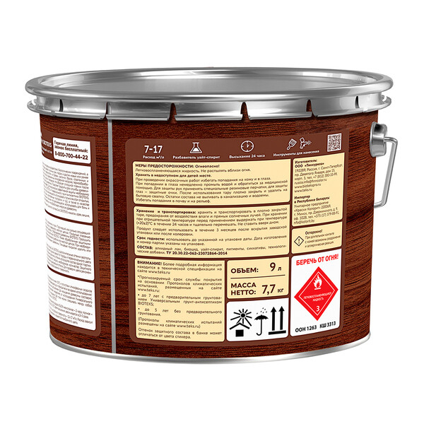 | Расход | 12-17 м2 /л по строганой и бревенчатой поверхности, 7 - 9 м2 /л по пилёной поверхности древесины |