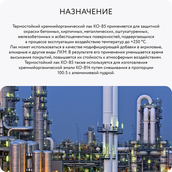 Термостойкий кремнийорганический лак. Лак КО-85 предназначен для изготовления эмалей, в том числе марки КО-814, получаемой смешением лака с алюминиевой пудрой ПАП-1, ПАП-2, а также для защитной окраски металлических, бетонных, стеклянных, керамических поверхностей для придания гидрофобных свойств, морозо – и коррозионностойкости металлических и иных типов поверхностей, подвергающихся в процессе эксплуатации воздействию температуры до +250 °С.