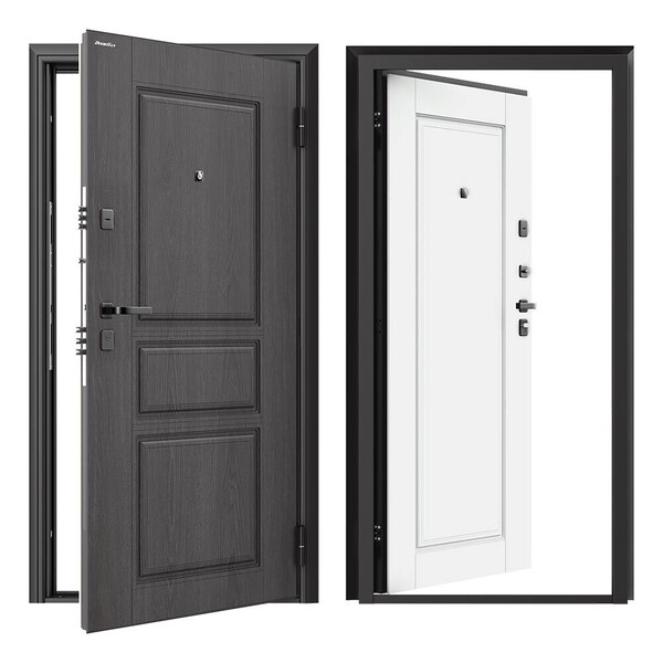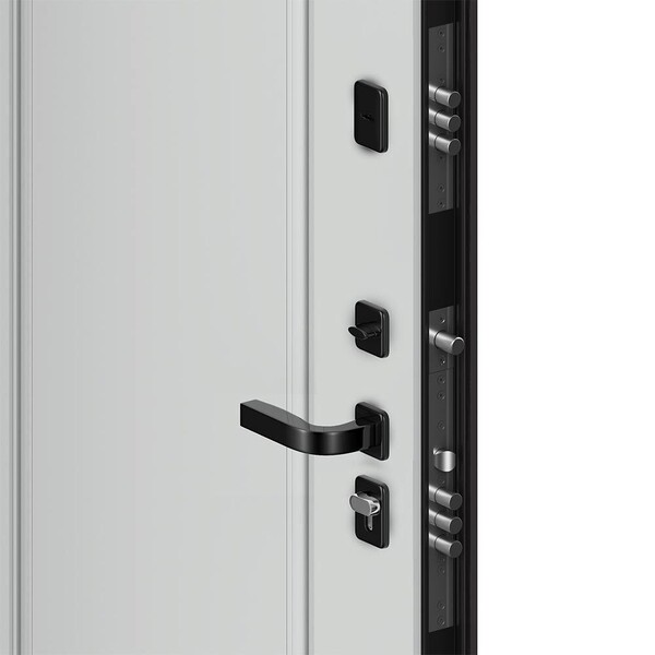 Входная дверь DoorHan Премиум предназначена для покупателей, которые ценят не только технические характеристики, но и привлекательный современный дизайн. Отличительная особенность – дверь полностью изготовлена из холоднокатаной оцинкованной стали толщиной 0,8 мм с использованием технологии бесшовного производства с 2-мя листами металла. В качестве наполнения используется огнестойкая минераловатная плита высокой плотности 130 кг/м?, заполнение полотна беспустотное. Снаружи МДФ панель в цвете Серый Графит с фрезеровкой «Классика», изнутри МДФ панель в белом цвете с фрезеровкой «Квадро».