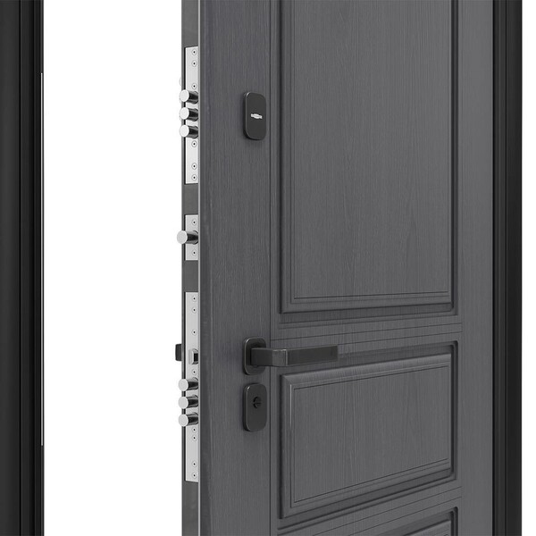 Входная дверь DoorHan Премиум предназначена для покупателей, которые ценят не только технические характеристики, но и привлекательный современный дизайн. Отличительная особенность – дверь полностью изготовлена из холоднокатаной оцинкованной стали толщиной 0,8 мм с использованием технологии бесшовного производства с 2-мя листами металла. В качестве наполнения используется огнестойкая минераловатная плита высокой плотности 130 кг/м?, заполнение полотна беспустотное. Снаружи МДФ панель в цвете Серый Графит с фрезеровкой «Классика», изнутри МДФ панель в белом цвете с зеркалом.