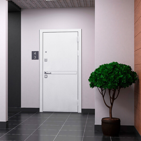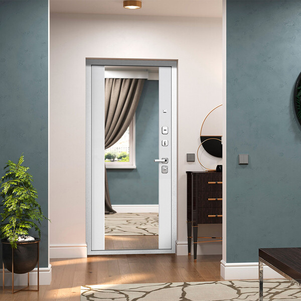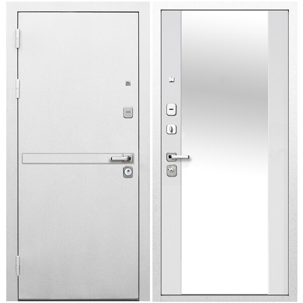 Дверь входная 9 см Металл/МДФ Белая Шагрень Эмалит белый зеркало 960 мм левая предназначена для установки в жилых и общественных зданиях в качестве входной двери внутри помещения. Полотно изготовлено из стали. Стальной лист 1 мм с атмосферостойким порошковым покрытием цвета «Белая шагрень», с зеркальной вставкой из нержавеющей стали. С внутренней стороны облицовано фрезерованной МДФ-панелью толщиной 16 мм, цвет "Эмалит белый" с зеркалом. Анкерные болты в комплект не входят и приобретаются отдельно. Диаметр отверстий под анкер – 25 мм. Длина анкера подбирается под тип стены.