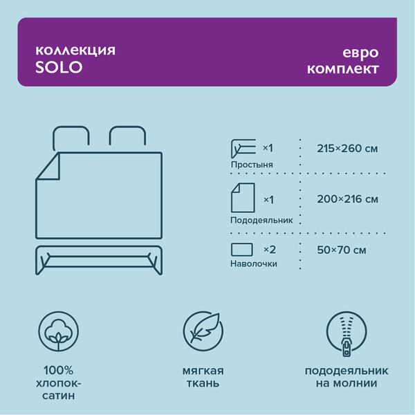 Комплект постельного белья из коллекции Solo выполнен из высококачественного хлопкового сатина. Пододеяльник в комплекте оснащен застежкой на молнии для дополнительной фиксации одеяла.