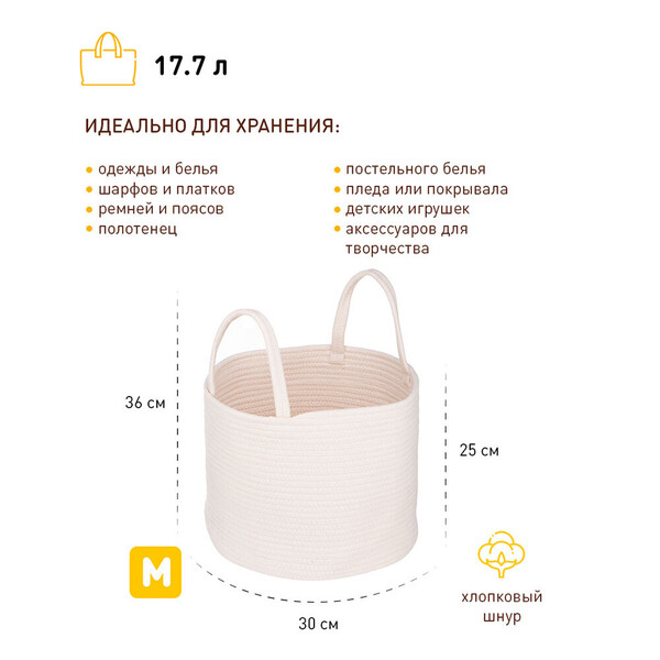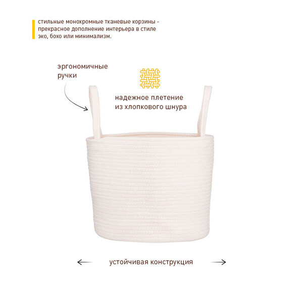 Стильная монохромная тканевая корзина "Хлопок" от Handy Home сплетена из хлопкового шнура актуального нюдового цвета. Она гармонично дополнит интерьер в стиле эко, бохо или минимализм и поможет навести порядок на полках стеллажа, на полу в спальне или в ванной комнате. Разместите в ней одежду или бельё, шарфы, платки, ремни или другие аксессуары, полотенца, постельное бельё, плед или покрывало с кровати, детские игрушки или аксессуары для творчества. Бежевый и его приглушенные оттенки, молочный и его вариации – эти комбинации уже стали базовыми, ведь они абсолютно универсальны. Материал изготовления корзины: хлопковый шнур.
