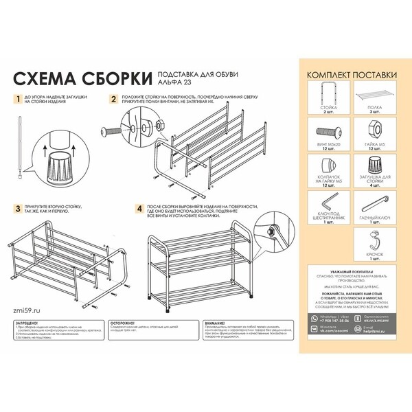 Подставка для обуви «Альфа 23» от российского производителя ЗМИ — это удобное решение для хранения обуви. Она сделана из металла, покрытого краской, и имеет три уровня. На ней можно разместить до 9 пар обуви. В комплекте есть пластиковый крючок, на который можно повесить ключи, зонтик и другие мелочи. Ножки подставки защищены пластиковыми заглушками, чтобы не поцарапать пол. Подставку можно использовать дома, в офисе, на даче, в детских комнатах, ванных, гостиных, спальнях, гардеробных, раздевалках, на балконах и в банях. Подставку легко собрать, в комплекте есть все необходимое. Гарантия от производителя – 3 года.