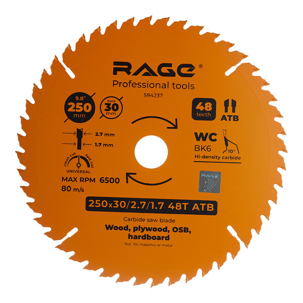 Предназначен для реза сырой строительной древесины, ДСП, МДФ, композиционных материалов. Попеременно скошенные зубья тип АТВ, угол скоса 15° и положительный угол атаки 10° обеспечивают аккуратный распил. В комплекте переходные кольца под посадочный диаметр 25.4, 20 и 16мм. Допускается эксплуатация диска с потерей зубьев до 20% не подряд.