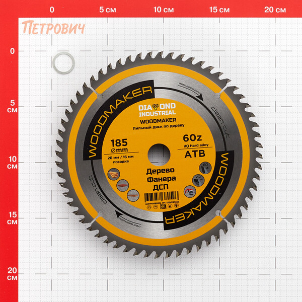 Диск пильный для работ по дереву, фанере, ДСП. Основа диска выполнена из углеродистой стали, напайки на режущих зубьях из твердого карбидно-вольфрамового сплава «победита». Качество сплава и размер твердосплавных напаек обеспечивают диску высокий рабочий ресурс, длительное сохранение скорости и качества реза, высокую пригодность к правке и заточке. Напаянные индуктивным способом твердосплавные переменные зубья с агрессивным углом резания АТВ обеспечивают одновременно быстрое и точное пиление.