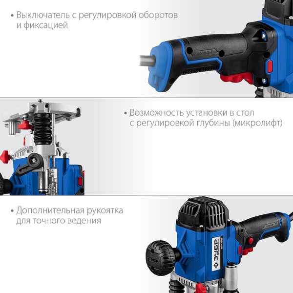 Фрезер Зубр серии Профессионал – многофункциональное изделие для всех видов фрезерования (продольного, фигурного, по шаблону, по радиусу) различных материалов. Мощный двигатель и максимальная глубина погружения 50 мм обеспечивают эффективную и производительную работу. Удобная эргономика и бОльшая маневренность благодаря удлиненной основной рукоятке способствуют удобству при работе.