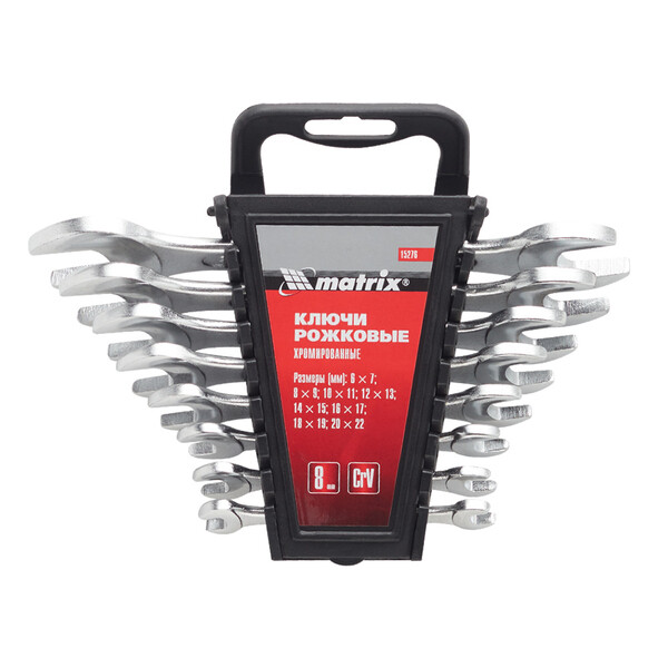 Набор рожковый ключей Matrix предназначен для закручивания резьбовых соединений, изготовлены из хромованадиевой стали. Твердость материала рабочей части ключа 45 HRC (требования ГОСТ – 45–51 HRC). Имеют полированное хромоникелевое покрытие. Поставляются в комплекте с трапециевидным пластмассовым держателем. Ключи гаечные двусторонние с открытым зевом предназначены для монтажа демонтажа резьбовых соединений.