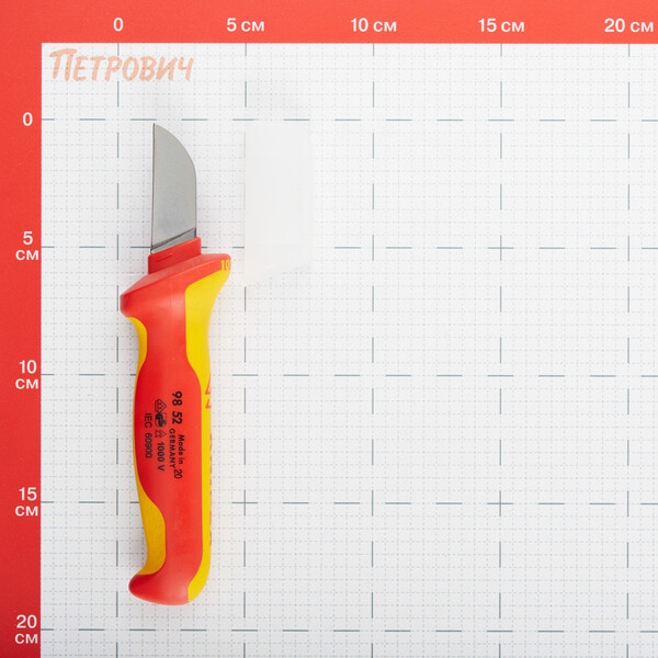 Предназначен для работы с электрическими проводами и кабелями. Инструмент имеет фиксированное лезвие с прямыми режущими кромками, отличающееся высокой прочностью. Рукоятка ножа снабжена специальной многокомпонентной изоляцией, служащей для защиты рук оператора от поражения электрическим током во время работы. Длина 190 мм. Длина лезвия 50 мм. В конструкции рукоятки предусмотрено специальное углубление для большого пальца и крючок на палец для лучшей передачи усилия. Данный инструмент испытан на соответствие нормам VDE и соответствует Закону о безопасности техники и продукции (GPSG). Возможно использование инструмента для электротехнических работ с переменными токами напряжением до 1000 В и с постоянными токами напряжением до 1500 В. Высокая надежность за счет применения мягких компонентов. Прозрачный защитный чехол для лезвия делает хран...