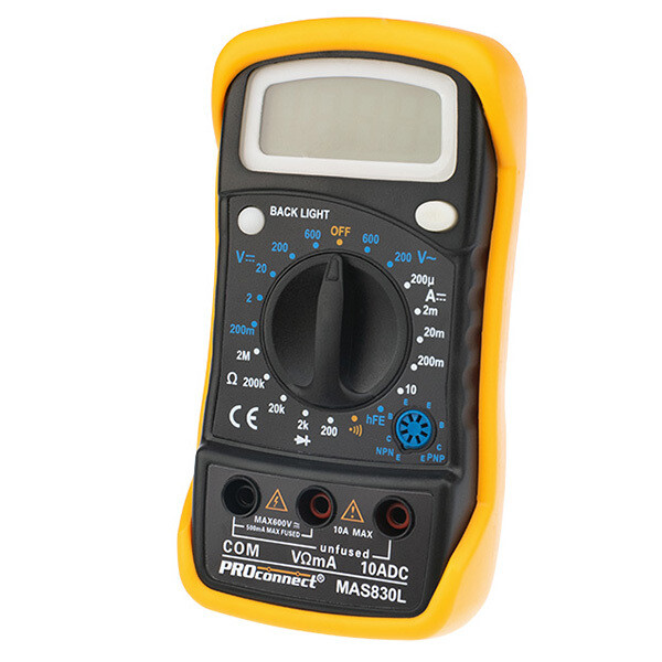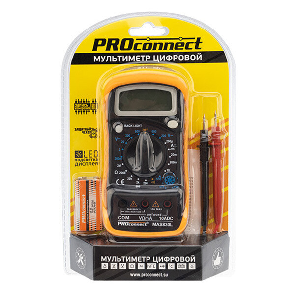 Предназначен для измерения постоянного и переменного напряжения, постоянного тока, сопротивления в цепи. Также с помощью данного прибора можно проводить тестирование диодов и прозвонку целостности цепи. Прибор MAS830L является портативным мультиметром, компактные размеры позволяют всегда носить его с собой. Но, несмотря на малые размеры, данный мультиметр обладает широким функционалом и это выгодно отличает его от других. Инженеры старались сделать прибор максимально удобным для использования. Выбор измеряемых величин и пределов измерений производиться с помощью усиленного поворотного регулятора, благодаря которому исключается возможность случайного нажатия. Прибор изготовлен из высококачественных материалов, калибровка и тестирование приборов произведено под контролем компании REXANT INTERNATIONAL.