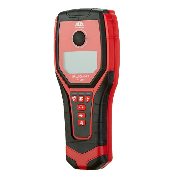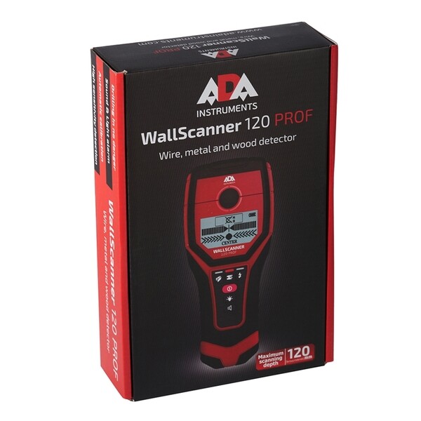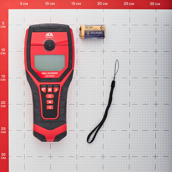 Детектор проводки ADA Wall Scanner 120 PROF А00485 с помощью электрического сигнала помогает обнаружить черные и цветные металлы, проводку под напряжением и деревянные конструкции в стенах, потолках и полах. Корпус из прочного материала и протекторные накладки делают его устойчивой к ударам и падениям. Модель работает от щелочной батарейки 9В, которой хватает на 5 часов работы. Устройство широко используется в сфере ремонта и снижает риск случайного повреждения внутренних элементов стен. Рекомендуется эксплуатировать прибор при температуре от -10 до +50 градусов.