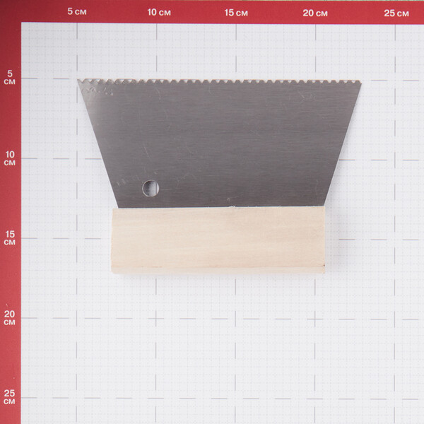 Шпатель зубчатый серии 66. Рабочее полотно шпателя изготовлено из нержавеющей стали, ручка из твердых пород дерева. Предназначен для нанесения клеевого состава для последующей укладки напольного покрытия. Ширина зубца – 0,6 мм, высота зубца – 1,4 мм.