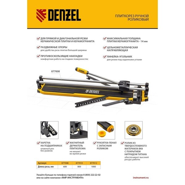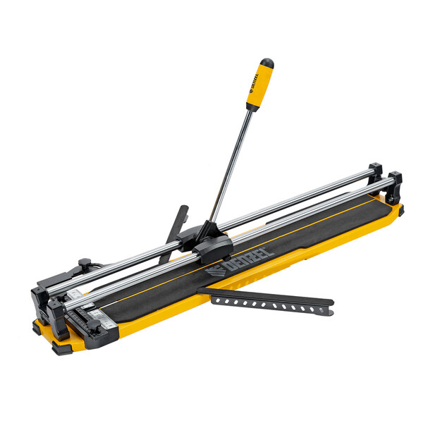 Ручной плиткорез с цельнометаллическими направляющими и стальной станиной, с кареткой на подшипниках и рукояткой-пеналом предназначен для прямой и диагональной резки керамической плитки и керамогранита длиной до 800 мм и толщиной до 14 мм. Раздвижные упоры упрощают работу с плиткой большого размера. Инструмент используется для проведения отделочных работ.