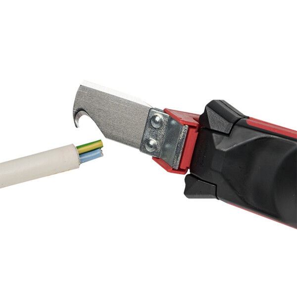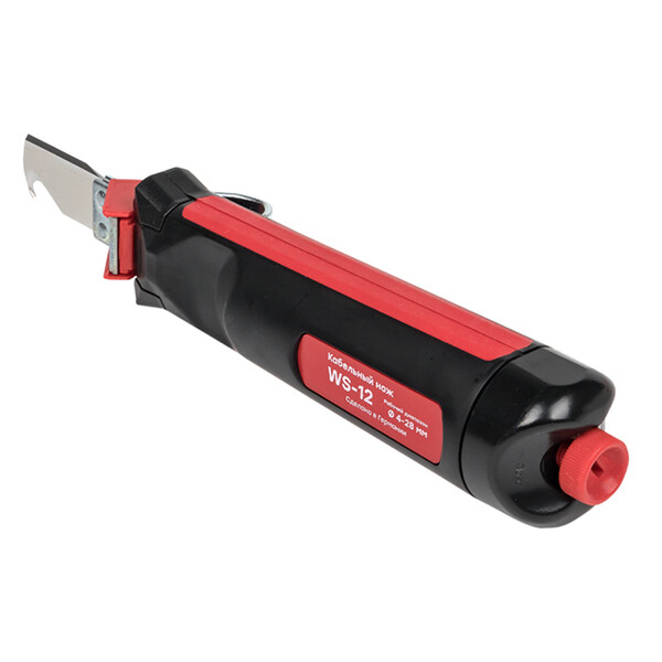 Предназначен для быстрого и аккуратного снятия ПВХ-оболочки круглых кабелей диаметром от 4 до 28 мм с помощью встроенного вращающегося лезвия-эксцентрика, позволяющего выполнять как круговой поперечный, так и продольный рез оболочки кабеля. Бесступенчатая регулировка глубины реза оболочки позволяет снимать ее, не повреждая изоляции внутренних жил. Наружное лезвие инструмента для безопасности закрывается пластиковым колпачком. Сменное внутреннее поворотное лезвие.