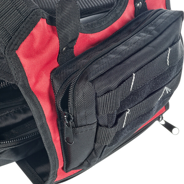 Предназначен для хранения и транспортировки инструмента. Имеет широкие мягкие регулирующиеся лямки, регулируемый поясной ремень и ручка для переноски, защелки-фиксаторы для изменения объема рюкзака, светоотражающие элементы на внешнем фронтальном кармане рюкзака, мягкие анатомические вставки на спинке рюкзака, прочные усиленные молнии с крупными звеньями. Рюкзак выдерживает вес до 10 кг. Конструкция – переднее и заднее внутренние отделения с отдельными молниями; переднее отделение с 10 карманами; заднее отделение с большим широким плоским карманом, 2 карманами из капроновой сетки и вшитым нейлоновым карманом на молнии с 3 крепежными элементами из резиновой ленты и 2 кармашками на липучках. 2 внешних фронтальных каскадных кармана на молнии, 15 крепежных элементов из светоотражающей ленты и 15 крепежных элементов из капроновой ленты на ...