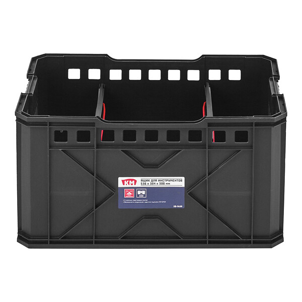 Этот ящик входит в состав модульной системы КМ Блок. Все ящики данной линейки соединяются друг с другом с помощью боковых защелок, формируя необходимую систему, предназначенную для хранения и транспортировки инструментов. Имеет 2 съемные перегородки внутри.