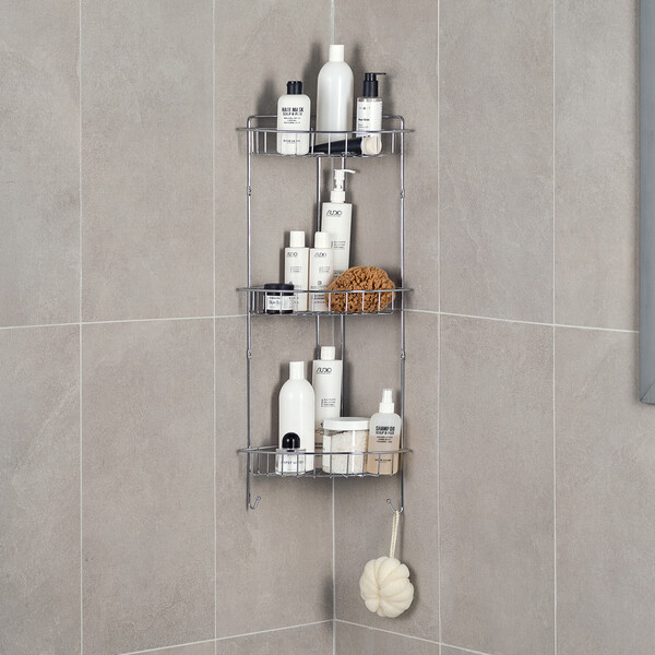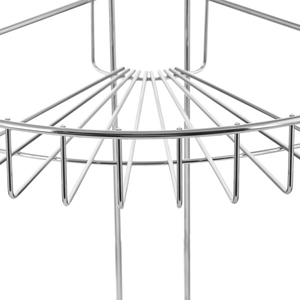 Трехъярусная угловая настенная полка из стали с гальваническим покрытием цвета хром.