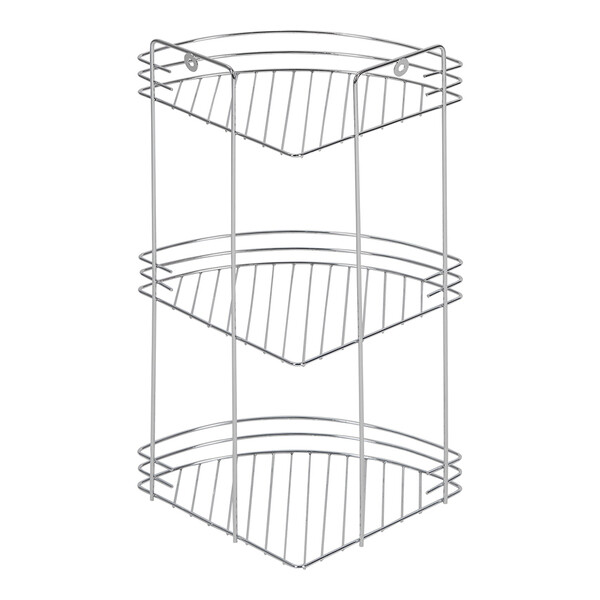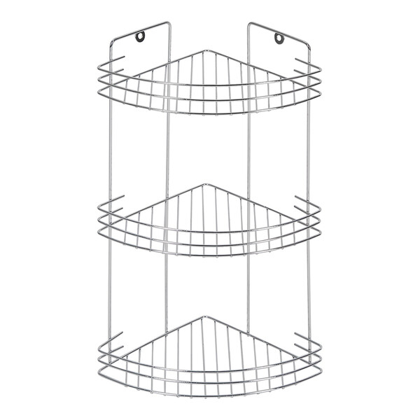 Полка металлическая, настенная, угловая, 3-х ярусная. Выполнена в цвете хром. Покрытие устойчиво к коррозии. Монтируется к стене при помощи крепления, входящего в комплект. Так же имеются металлические ножки (не оснащенные силиконовыми заглушками), что позволяет поместить данную полку на любой плоской поверхности. Расстояние от угла до крепления 11,5 см. Толщина прутьев – 0,32 см; 0,3 см; 0,19 см. Высота борта 3,5 см. Максимальная нагрузка 4,5 кг.
