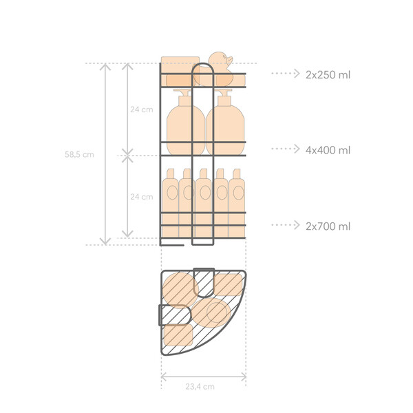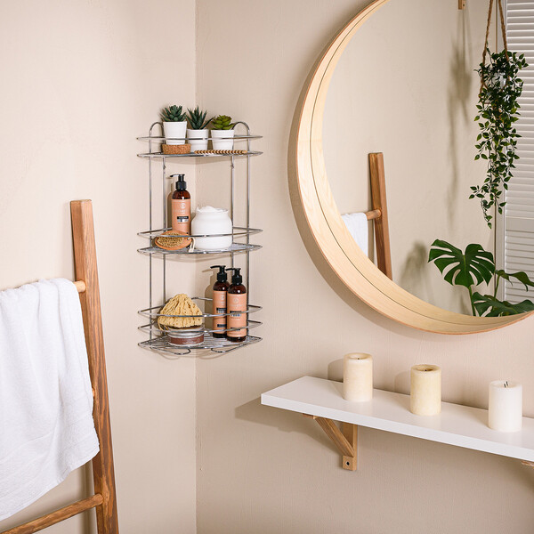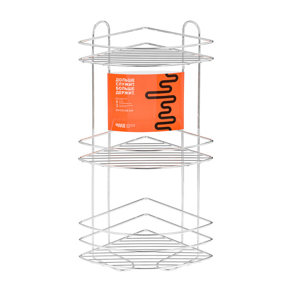 Трехъярусная угловая настенная полка из стали с гальваническим покрытием цвета хром.