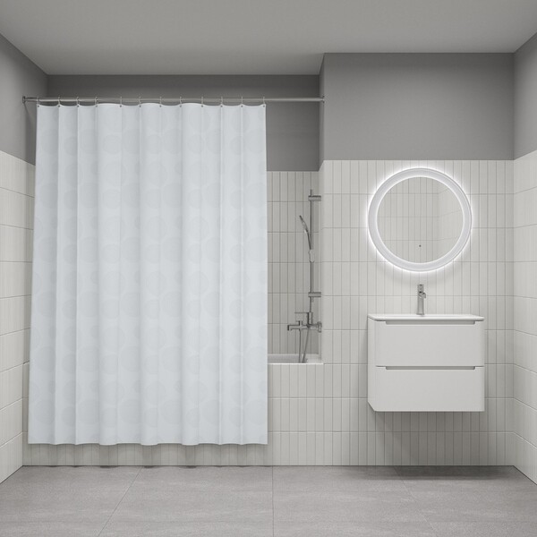 Текстильная штора для ванной белого цвета с деликатным принтом освежит пространство и привнесет в него легкое настроение. Изготовлена из износостойкого полиэстера с водоотталкивающей пропиткой. При попадании на ткань вода не впитывается, а скатывается каплями, даже при сильном напоре воды. По верхнему краю расположены 12 прозрачных пластиковых люверсов. Штора имеет утяжеляющую нить по нижнему краю, которая позволяет избежать задирания ткани. Легко ухаживать – шторку для ванной комнаты можно стирать в стиральной машине в деликатном режиме и гладить утюгом на минимальной температуре.