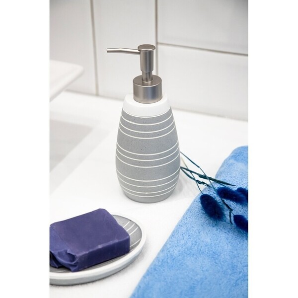 Дозатор Granit объемом 340 мл имеет округлую мягкую форму и фурнитуру цвета матового серебра. Аксессуар приятен на ощупь, потому что материал полирезин имеет низкую теплопроводность. Входит в состав коллекции Granit.