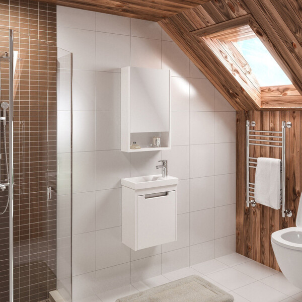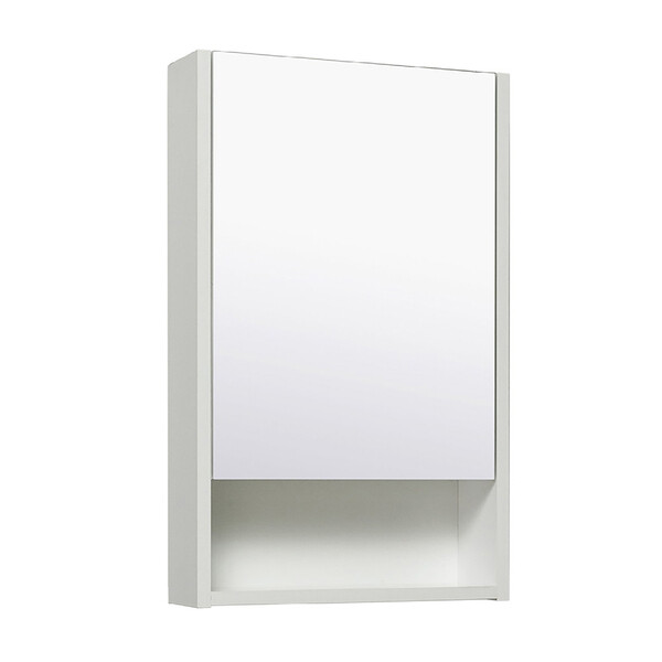 Зеркальный шкаф без подсветки с распашным фасадом и открытой нижней полкой (петли справа). Петли со встроенным доводчиком.