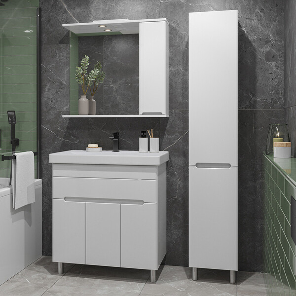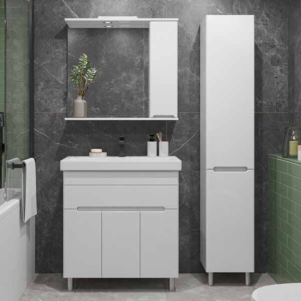 Тумба напольная Модена 80 комплектуется раковиной Фостер 800. Выполнена в современном стиле и имеет большую функциональность и вместительность. Корпус изготовлен из влагостойкого ЛДСП, фасады из МДФ, покрытые глянцевой пленкой увеличенной толщины. Выдвижной ящик с шариковыми направляющими, дверцы с доводчиками имеют мягкое закрывание.