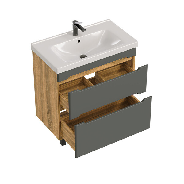Тумба напольная Diva 80 комплектуется раковиной Комо 80. Выполнена в современном стиле. Корпус изготовлен из ламинированного ДСП – цвет Дуб Вотан. Фасады изготовлены из МДФ и покрыты матовой пленкой Графит Софт. Два выдвижных ящика с направляющими скрытого монтажа и доводчиками имеют мягкое закрывание.