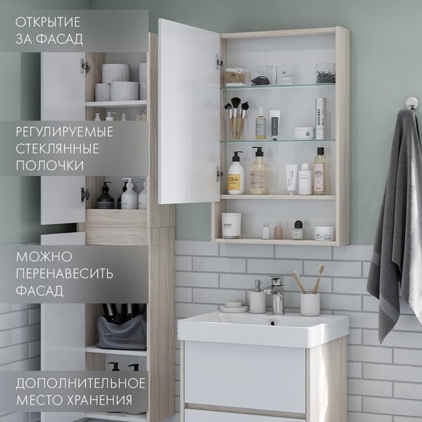 Предназначен для оборудования ванных комнат. Зеркальный шкаф коллекции Сканди включает регулируемые стеклянные полочки за зеркальным фасадом и открытую нишу для косметических средств, которые всегда должны быть под рукой. По желанию можно дополнительно приобрести светильник.