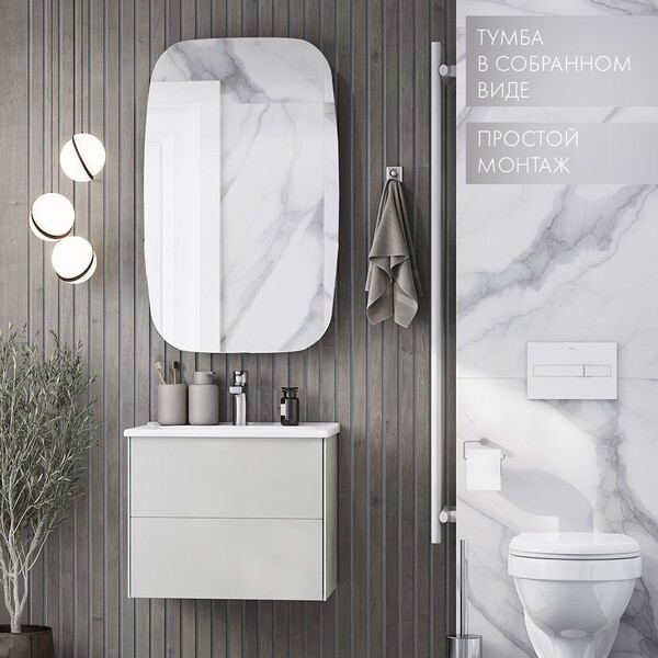 Тумба Сохо 60 функционально состоит из двух вместительных ящиков, оснащенных системой push to open, обеспечивающей надежное, комфортное и бесшумное закрывание. Фасады изделия выполнены из МДФ в пленке в цвете галька серая, корпус из ламинированной влагостойкой ДСП слэйт. Верхний и нижний ящики позволяют содержать косметические средства в идеальном порядке. Дополняет тумбу стильная раковина Элина от бренда Santek с удобной чашей. Все внутренние детали тумбы выполнены в цвете антрацит.